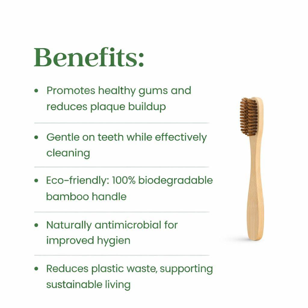 The Bamboo Toothbrush offers an eco-friendly way to care for your teeth while protecting the environment. Made from 100% bamboo, it has natural antimicrobial properties that prevent the growth of harmful bacteria. The soft, charcoal-infused bristles help remove plaque and stains gently, leaving your teeth bright and clean without damaging the enamel. Unlike plastic toothbrushes, our bamboo brush is biodegradable, making it safe for the planet. It's splinter-free and comfortable to hold, ensuring a pleasant brushing experience for adults and kids alike. This sustainable toothbrush is a small change that contributes to reducing plastic waste and promoting healthier oral hygiene.